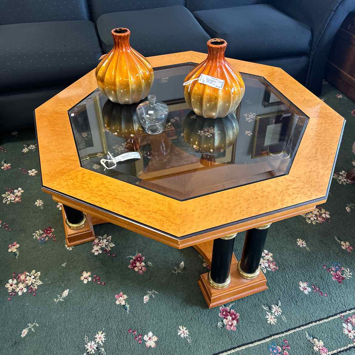 Octagon Wood & Glass Coffee Table w/Black Legs