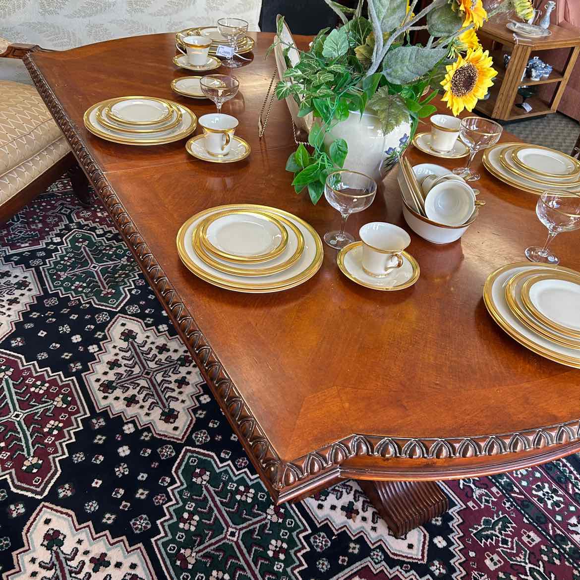 Wood 2 Pedestal Legs Table w/Carved Out Edge/2 Leaves